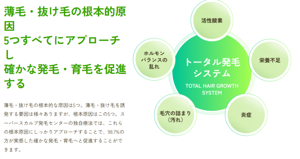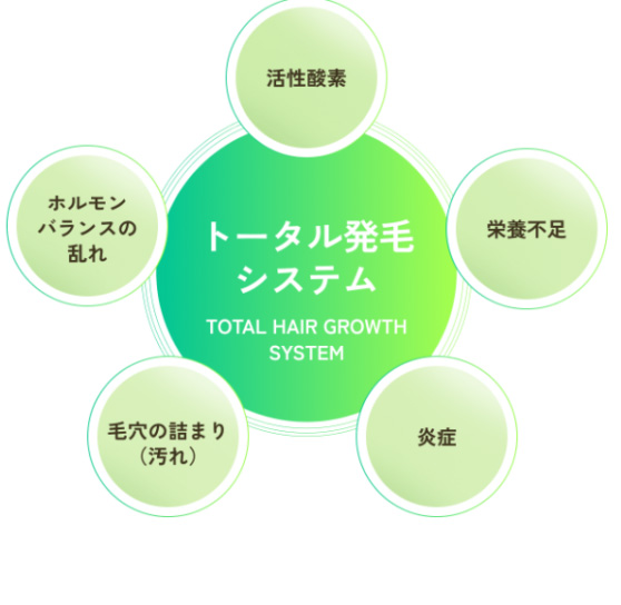スーパースカルプトータル発毛システムは、薄毛・抜け毛の根本的原因、5つすべてにアプローチし確かな発毛・育毛を促進します。5つの原因を誘発する要因は様々あります。頭皮環境はもちろん、メンタル・身体に関することなどあらゆる要因が複合的に起因します。人それぞれ異なる根本原因を誘発するあらゆる要因を特定し、徹底的にケアしていきます。